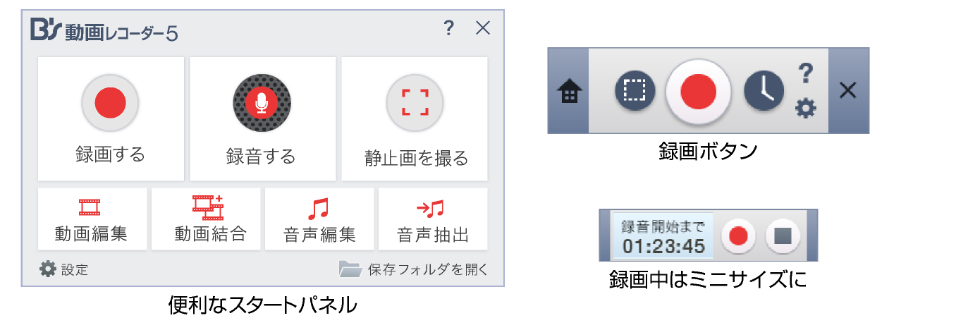 スタートパネルから各機能を迷わず使えます。録画中は邪魔にならないコンパクトサイズに自動で変わります。